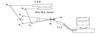 两束等强度的相干偏振光作为写入光,交叠照射在样品(图3中的H)上,两束光的夹角为q,由于这两束光满足相干条件,因此在样品上产生明暗相间的干涉条纹,条纹间距L=2/lsinq(/2),条纹的光强分布为周期性正弦分布。处于条纹亮区的样品中,不断有反式分子吸收光子转变为顺式分子,产生的顺式分子不断地被偏振光的电场取向,最终亮条纹区所有顺式分子,其分子主轴的排列方向都平行于干涉场偏振光的电矢量。暗条纹区只产生少量的顺式分子,多数偶氮分子以反式结构存在,且呈无规则排列。
