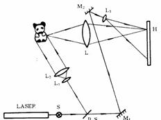全息照相是现代光学比较典型的实验,在中学新课标中也有对此实验的观察要求。全息照相的记录光路如图4所示。我们可以直接观察全息图像,也可以用全息干板记录物光和参考光的干涉图样,冲洗后,用参考光再现全息图。