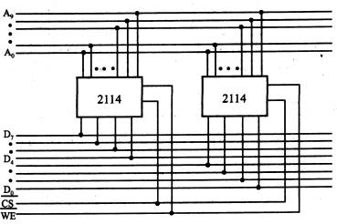 分别连在一起,其中一片的数据线作为高4位D7~D4,另一片的数据线作为低四位D3~D0。这样,它便构成了一个1K×8位的存储器。
