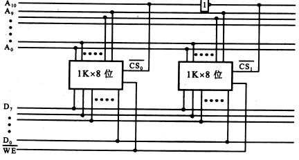 (2)字扩展。字扩展是指增加存储器字的数量。如用2片1K×8位的存储芯片,可组成一个2K×8位的存储器,即存储字增加了一倍,如下图所示。