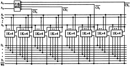由图可见,每两片构成1K×8位的存储器,4组两片便构成4K×8位的存储器。地址线A11、Al0经片选译码获得4个片选信号