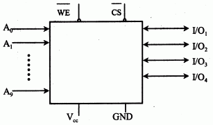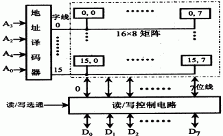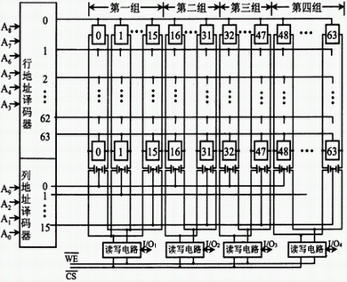 为高电平,在读写电路的输出端I/Ol~I/O4便输出第0行的第0、16、32、48这4个单元电路所存的信息。若做写操作,将写入信息送至I/O1~I/O4端口,并使