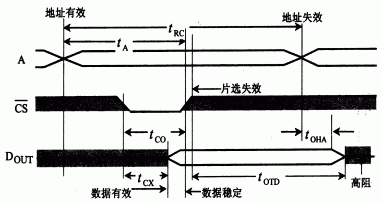 需注意,从片选失效到输出高阻需一段时间tOTD,故地址失效后,数据线上的有效数据有一段维持时间tOHA,以保证所读数据可靠。