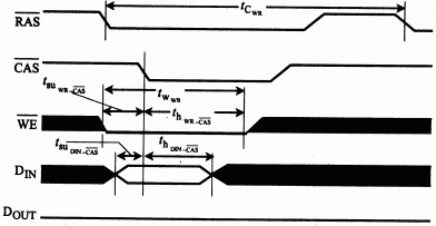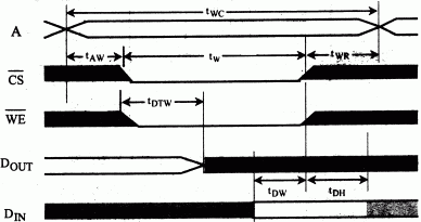 均需滞后tAW再有效,以避免将无效数据写入到RAM的错误。但写允许 失效后,地址必须保持一段时间,叫做写恢复时间。此外,RAM数据线上的有效数据(即CPU送至RAM的写入数据DIN)必须在 、 失效前的tDW时刻出现,并延续一段时间tDH(此刻地址线仍有效,tWR>tDH), 以保证数据可靠写入。