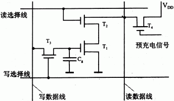 读出时,先对预充电管T4置一预充电信号(在存储矩阵中,每一列共用一个T4管),使读数据线达高电平VDD,然后由读选择线打开T2,若Tl的极间电荷Cg存有足够多的电荷(被认为原存“1”),使T1导通,则因T2、Tl导通接地,使读数据线降为零电平,读出“0”信息。若Cg没足够电荷(原存“0”),则T1截止,读数据线为高电平不变,读出“1”信息。可见,由读出线的高低电平可区分其是读“1”,还是读“0”,只是它与原存信息反相。