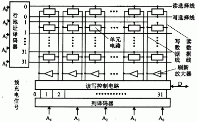 这是一个1K×1位的存储芯片,图中每一小方块代表由3个MOS管组成的动态RAM基本单元电路。它们排列成32×32的矩阵,每列都有一个刷新放大器(用来形成再生信息)和一个预充电管,芯片有10根地址线,采用重合法选择基本单元电路。