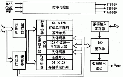 控制,分两次分别存入行、列地址缓存器。行地址经行译码后选中一行,使该行上所有的MOS管均导通,并分别将其电容Cs上的电荷反映到128个读放大器的某一侧(第0~63行反映到读放大器的左侧,第64~127行反映到读放大器的右侧)。读放大器实质上是个触发器,其左右两侧电平相反。此外列地址经列译码后选中某一列,该列上的列地址选择管导通,即可将读放大器右侧信号经读/写线、I/O缓冲器输出至DOUT端。例如,选中第63行、第0列的单管MOS电路,其CS有电荷为“1”状态,则反映到第0列读出放大器的左侧为“1”,右侧为“0”,经列地址选择管输出至DOUT为0,与原存信息反相。同理,第0~63行经读出放大器至输出线DOUT的信息与原存信息均反相,而读出第64~127行时,因它们的电容CS上的电荷均反映到读出放大器的右侧,故经列地址选择管输出至DOUT的信息为同相。