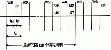 显然,这种刷新克服了集中刷新出现“死区”的缺点,但它并不能提高整机的工作效率。因为尽管刷新分散在读/写周期之后,但刷新同样需要一个读/写周期时间,结果使机器存取周期由0.5μs变成1μs,使整机工作效率下降。