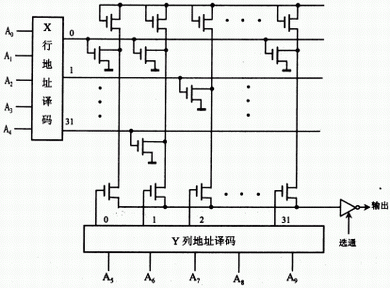 读出时,先置以预充电信号,接着按行地址A9~A5经行译码器给出读选择信号,同时由列地址A4~A0经列译码器给出列选择信号。只有在行、列选择信号共同作用下的基本单元电路,才能将其信息经读数据线送到读写控制电路并从数据线D输出。