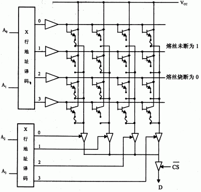 在这个电路中,基极由行选择线控制,发射极与列线之间形成一条镍铬合金薄膜制成的熔丝(可用光刻技术实现),集电极接电源VCC。用户在使用前可按需要将信息存入行、列交叉的耦合元件内。若欲存“0”,则置耦合元件—个大电流,将熔丝烧掉。若欲存“1”,则耦合处不置大电流,熔丝不断。当被选中时,熔丝断掉处将读得“0”,熔丝未断处将读得“1”。当然,已断的熔丝是无法再恢复的,故这种ROM往往只能实现一次编程,不得再修改。