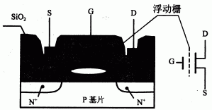 由图所示的N型沟道浮动栅MOS电路,在漏端D加上正电压(如25V,50ms宽的正脉冲),便会形成一个浮动栅,它阻止源S与漏端D之间的导通,致使此MOS管处于“0”状态。若对D端不加正电压,则形成不了浮动栅,此MOS管便能正常导通,呈“1”状态。由此,用户可按需要对不同位置的MOS管D端加正电压或不加正电压,便制成了用户所需的ROM。一旦用户需重新改变其状态时;可用紫外线照射、驱散浮动栅,再按需要对不同位置的MOS管重新置于正电压,又得出新状态的ROM。故称之为EPROM。