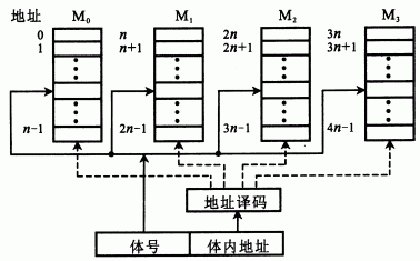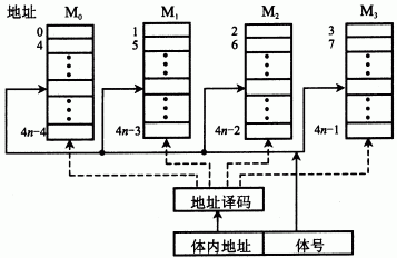 在按低位交叉编址的多体模块结构示意中,程序连续存放在相邻体中,显然低位地址用来表示体号,高位地址为体内地址。这种编址方法又叫作模M编址(M等于模块数),一般模块数M取2的方幂,使硬件电路比较简单。有的机器为了减少存储器冲突,采用质数个模块,如我国银河机的M为3l,其硬件实现比较复杂。