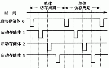 多体模块结构的存储器采用交叉编址后,可以在不改变每个模块存取周期的前提下,提高存储器的带宽。下图示意了四个存储体交叉访问的时间关系,负脉冲为启动每个体的工作信号。虽然对每个体而言,存取周期均未缩短,但由于CPU交叉访问各体,最终在一个存取周期的时间内,实际上向CPU提供了4个存储字。如果每模块存储字长为32位,则在一个存取周期内,存储器向CPU提供了32×4=128位二进制代码,大大加宽了存储器的带宽。