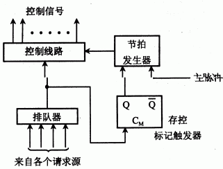 (2)存控标记触发器CM。它用来接受排队器的输出信号,一旦响应某请求源的请求,CM被置“1”,以便启动节拍发生器工作。