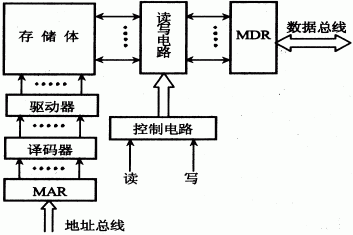 主存的实际结构如上图所示,当根据MAR中的地址访问某个存储单元时,需经过地址译码、驱动等电路,才能找到所需访问的单元。读出时,需经过读出放大器,才能将被选中单元的存储字送到MDR。写入时,MDR中的数据也必须经过写入电路才能真正写入到被选中的单元中。
