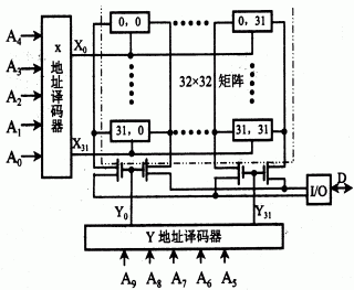 上图是一个1K×1位重合法结构示意图。显然,只要用64根选择线(X、Y两个方向各32根),便可选择32×32矩阵中的任一位。例如当地址线为全0时,译码输出X0和Y0有效,选中矩阵中的第0行、第0列对应位。由于被选单元是由X、Y两个方向的地址决定的,故称重合法。