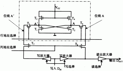 图中T1~T4是一个由MOS管组成的触发器基本电路,T5、T6尤如一个开关,受行地址选择信号控制。由T1~T6共同构成一个六管MOS基本单元电路。T7、T8受列地址选择控制,分别与位线A和A′相连,它们并不包含在基本单元电路内,而是芯片内同一列的各个基本单元电路所共有的。