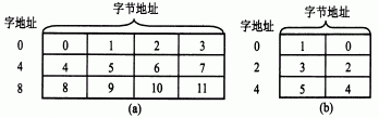 主存各存储单元的空间位置是由单元地址号来表示的,而地址总线是用来指出存储单元地址号的,根据该地址可读出一个存储字。不同的机器存储字长也不同,为了满足字符处理的需要,常用8位二进制数表示一个字节,因此存储字长都取8的倍数。通常计算机系统既可按字寻址,也可按字节寻址。例如IBM370机其字长为32位,它可按字节寻址,即它的每一个存储字包含4个可独立寻址的字节,其地址分配如下图 (a)所示。字地址是用该字高位字节的地址来表示,故其字地址是4的整数倍,正好用地址码的末两位来区分同一字的4个字节的位置。但对PDP-11机而言,其字地址是2的整数倍,它用低位字节的地址来表示字地址,如下图(b)所示。