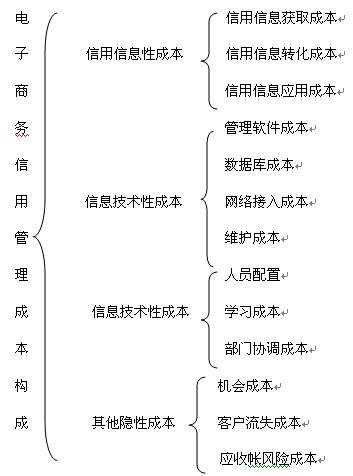 电子商务信用管理过程中,信用总是以信息的形式表现,为此我们可将信用管理过程分为信用信息的数据处理阶段和信用信息的价值实现阶段两个层次。前者主要是利用信息技术、网络技术对信用信息进行处理,是信用管理的初级阶段;后者则需将结构化的信用信息应用于管理,是信用管理的高级阶段。基于以上分析,我们可以按电子商务信用管理的实施过程将其成本分为信用信息性成本、信用技术性成本、信用组织性成本以及其他隐性成本。
