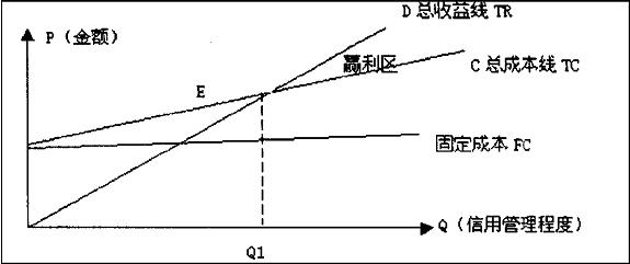 电子商务信用管理的成本—效益分析是指对信用管理效益与信用管理成本之间关系的判断。电子商务信用管理的目的在于实现交易风险的最小化和效益的最大化,对成本—效益进行分析为这一目标的实现提供了保障。通过上面对电子商务信用管理的成本效益分别分析后,我们可利用下图进行成本—效益分析,确定电子商务信用管理的盈亏平衡点,辅助授信人作出投资决策。