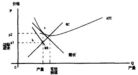 2. 2. 3 信息商品的市场结构特征分析。由于信息商品的特殊成本结构和激烈的市场竞争(尤其是技术竞争) ,使得信息商品市场结构呈现出垄断性和差别市场,这种市场结构对信息商品的定价产生了很大的影响。a. 垄断性的市场结构。在这类市场中存在技术领先者,它凭借其技术优势构筑进入壁垒,在网络效应和正反馈机制的作用下导致强者更强、弱者更弱的竞争局面,最终可能形成“赢家通吃”的垄断性市场结构。按照传统的经济理论,供应商应该采取垄断高价,但从现实市场来看,拥有这种地位的厂商对商品的定价不一定是垄断高价,而往往采取低于传统理论所确定的垄断价格的价格。对于信息商品,也存在同样的现象。如微软对视窗98 操作系统的定价为20 美元,与操作系统的历史价格及其他操作系统的价格相比,其价格并未高出许多。b. 差别商品的市场结构。这类市场结构具有普遍性。正因为领先者在市场上获得了丰厚的利润,必然引起其他竞争者的进入。竞争者进入的唯一办法是创新,通过创新将有差异的信息商品投放到特定的细分市场上,从而逐步与领先者展开竞争,这就逐渐形成了一批生产同类信息商品的公司,但具体的内容不一样。这种许多出售相似而不相同的信息商品的企业的市场结构带有垄断竞争色彩,其定价多高于完全竞争市场价格而又低于垄断市场的价格。如图4 所示:当商品提供商按照竞争市场机制定价时即收取MC = MR 时的价格p1 ,而p1 小于企业的ATC(平均总成本) 从而产生亏损,故不可取;这种市场的价格定在p2 (需求与平均总成本相切的点) ,此时的产量小于社会合意的有效规模( 边际成本MC 与平均总成本ATC 的交点) 。上述分析表明,信息商品市场只能存在两种基本类型,即龙头企业垄断市场和差异商品市场。当然这两种模式的混合形态也同样存在,许多软件市场既有差异商品,又有分割的市场份额;商家之间既相互竞争,又有专业分工。