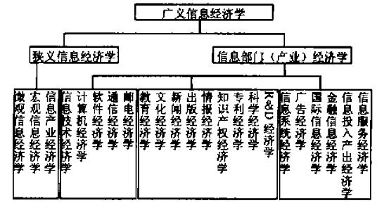 由前所述,信息经济学在其产生与发展的历程中综合性及边缘性的特点决定了其研究者们知识背景的多样性,而来自不同领域的学者因其关注的基本问题不同,在知识结构上存在差异,这卫决定了其研究对象、内容、方法及研究习惯和思维方式方面的不同,这是信息经济学研究中存在各分支领域的缘由=随着各领域研究的不断深入,相应形成了信息经济学的各分支学科,形成了上下位类学科关系 因此,把信息经济学看成是有关信息经济知识体系的学科群更为恰当。鉴于此,可以把信息经济学划分为广义信息经济学和狭义信息经济学,其中,狭义信息经济学仅包括上述理论体系中的微观、宏观信息经济学以及信息产业经济学,而广义信息经济学不仅包括狭义信息经济学,还包括3个子学科群,分别是:① 纯信息部门(产业)经济学分支群.如信息系统经济学、广告经济学、国际信息经济学、金融信息经济学、信息资源管理学、信息服务经济学、信息投入产出经济学等。② 信息技术部门(产业)经济学分支群,如信息技术经济学、计算机经济学、软件经济学、通信经济学、邮电经济学等。③广义信息生产与分配部门(产业)经济学分支群,如教育经济学、文化经济学、新闻经济学、出版经济学、情报经济学、知识产权经济学、专利经济学、科学经济学、研究与发展经济学等。
