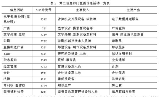 第二信息部门是一个比较难界定但又不能忽视的信息部门,包括政府或非信息企业为了内部消费而创造出的一切信息服务。它的信息活动过程是,由第一信息部门购进信息商品和信息服务,作为第二信息部门的中间投入进行生产,然后在第二信息部门内部消费掉。它的目的并不是向市场上提供信息商品,而只是向本部门内提供必须的信息服务。它所从事的信息服务的生产是辅助性的,最具有这种特征的是政府公共管理部门和民间管理部门,而这些部门是分散在各个不同的产业中,在农业、工业、服务业中都占有或大或小的比重。另外,在非信息部门,也存在信息活动的问题,如会计、文书、通讯联络等,也应该将这些活动划入第二信息部门。因此,对第二信息部门信息生产的投入和产出直接测定是相当困难的,只能通过信息工作者的收入和购置的信息资本货物折旧来间接测算。按照SIC的分类标准,第二信息部门的主要信息活动见表1。
