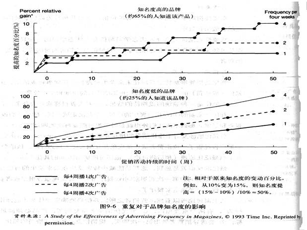 但也有研究认为应该重复11—12次,这样效果更好。总之,重复的有效性部分依赖于消费者接触到的竞争性的广告的数量,竞争性广告的水平越高,出现干扰的可能性越大,越容易使消费者遗忘前面通过重复学习获得的广告信息。