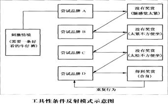在消费行为中,工具性条件反射指消费者是通过尝试错误的过程来学习的,一次有利的经历在教个体重复某种行为方面是很有帮助的。 |