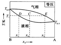 杠杆规则 在图的两相区,系统点C代表了系统总的组成的状态点。通过C点作平行于横坐标轴的等温线,与液相线和气相线分别交于D点和E点。DE线称为等温连结线,落在DE线上所有系统点对应的液相和气相组成,都由D点和E点的组成表示。杠杆规则可以表示为