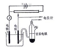 超电势的测定采用“三电极法”。在盛有电解液的电解池内,插入两个电极,其中阴极为待测电极,外接电源并串联一可变电阻,用来调节通过电解池的电流,电流的大小可由安培计读出。在阴极附近插入一甘汞电极并与阴极组成电池,其电动势可由电位计测得。因甘汞电极的电极电势为已知,故可得出不同电流密度下阴极的电极电势。以电极电势或为纵坐标,电流密度为横坐标,将测量结果绘制成图,即得阴极极化曲线或阳极极化曲线。